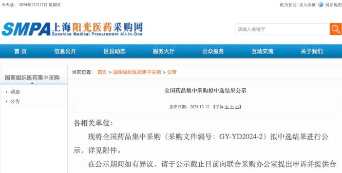 国家组织药品联合采购办公室表示,第十批国家组织药品集中采购拟中选结果已公示,以联合体方式参与申报获得拟中选资格的企业,于2024年12月16日下午16时前,以书面形式向国家药品联合采购办公室报告联合体内部自行协商的供应地区确认结果,每个供应地区仅由一家企业供应。