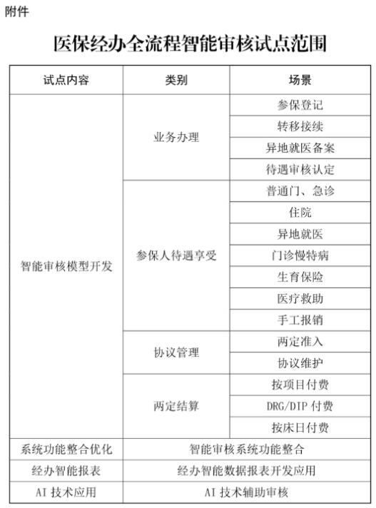 总结推广(2027年4月-2027年12月):国家局总结相关省份试点工作情况,梳理优秀经验,全国推广。扩大试点范围,将更多场景、更多省份纳入试点范围。国家层面建立医保经办全业务全流程智能审核体系,建立健全智能审核知识库、规则库和经办审核模型库,下发各地使用。